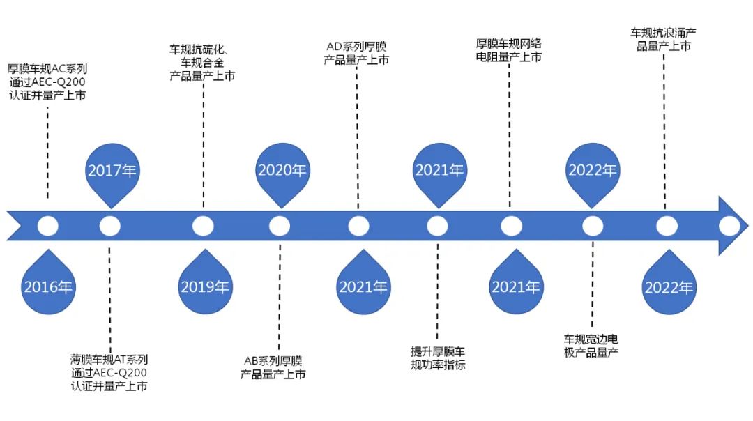 近年來,公司持續拓展汽車電子市場規模,用技術創新賦能汽車產業,從汽車電子客戶產品設計前端導入,形成厚膜、合金、薄膜三大技術平臺,產品技術成熟穩定,在高功率、高精度、高壓、耐高溫、高阻值等性能方面處于國內領先水平。公司于2016年建成國內第一條車規電阻生產線,目前,公司車規系列電阻產品齊全,全線產品均已通過 AECQ-200測試,并與國內多家汽車電子、動力電池配套廠家客戶建立了戰略合作關系。