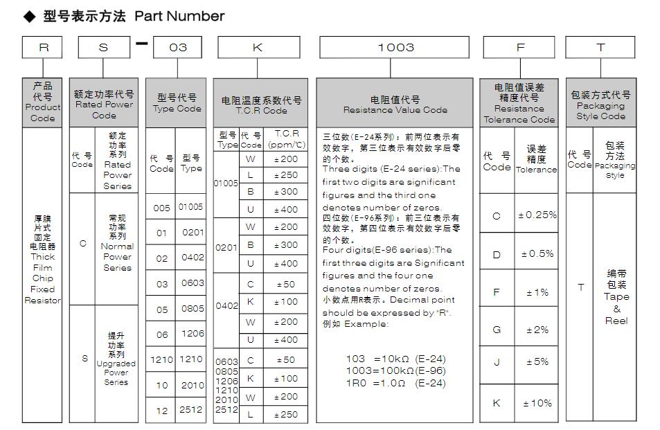 風(fēng)華常規(guī)厚膜片式固定電阻器型號表示方法: