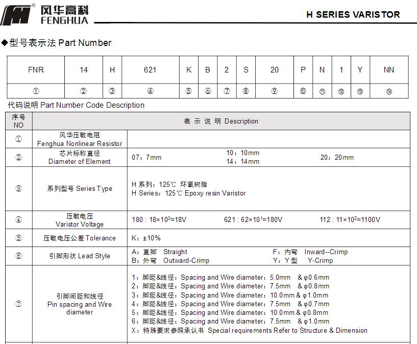 風華高科H系列壓敏電阻器型號命名規則: