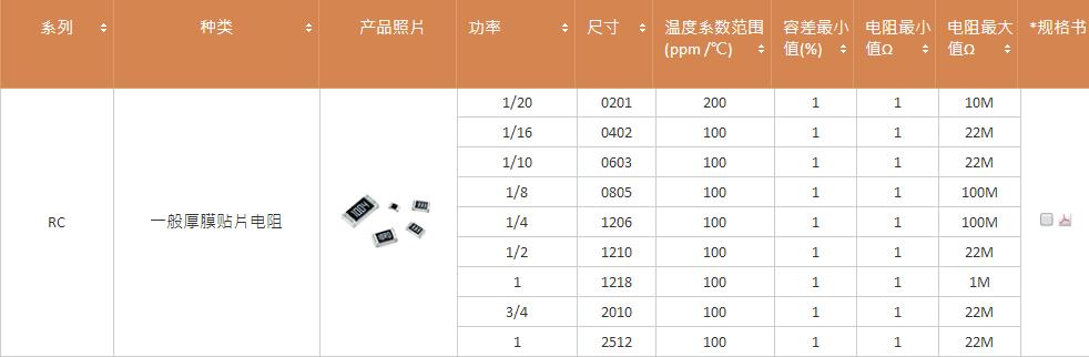 產品功率:1/50W、1/32W、1/20W、1/16W、1/10W、1/8W、1/4W、1/2W、3/4W、1W、2W