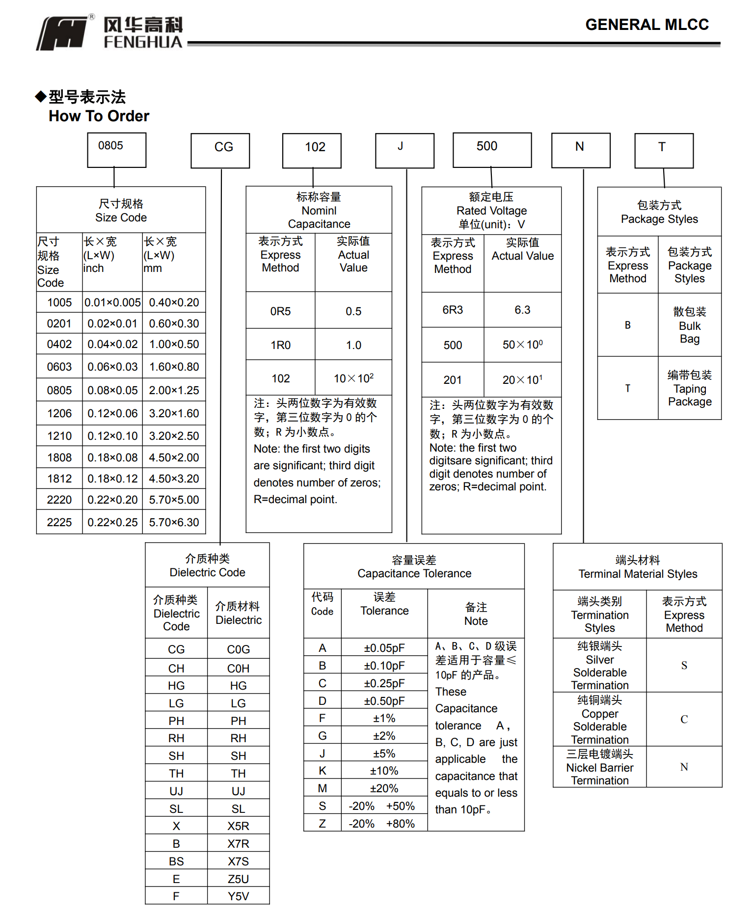 風華電容標簽規格對照表:例如風華電容型號:0805CG102500NT0805 :尺寸CG:材質102容量:1nF 500:電壓50VT:包裝方式 -編帶包裝