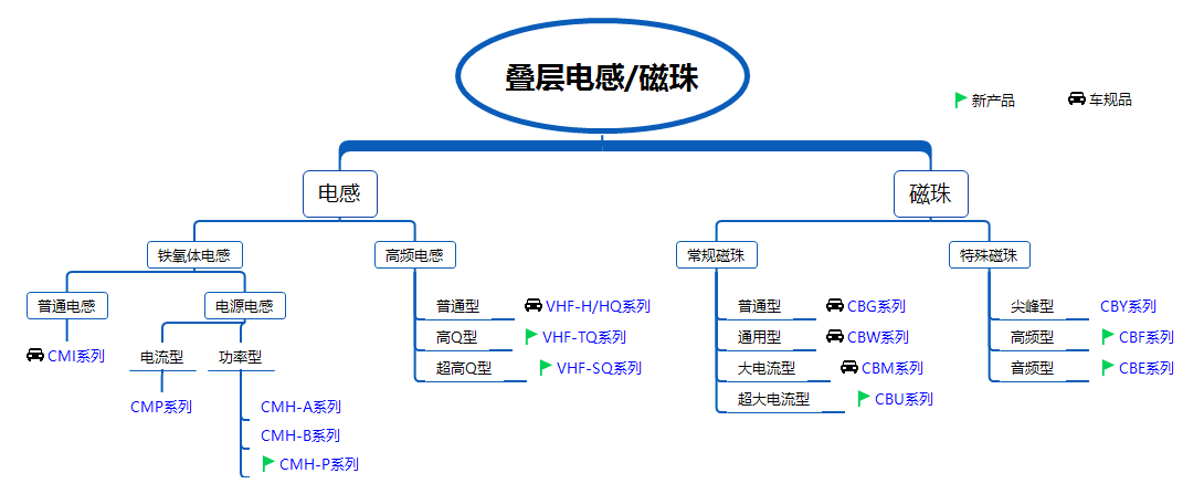 風華高科疊層電感/磁珠: 風華電感:鐵氧體電感 高頻電感 鐵氧體電感 :分為普通電感 CMI系列 電源電感:電流型CMP系列 功率型-CMH-A系列 CMH-B系列 CMH-P系列 高頻電感:分為普通型 普通型VHF-H/HO系列 高Q型VHF-TQ系列 超高Q型-VHF-SO系列 風華磁珠:常規磁珠 特殊磁珠 常規磁珠:分為普通型CBG系列 通用型CBW系列 大電流型CBM系列 超大電流型CBU系列 特殊磁珠:分為尖峰型CBY系列 高頻型CBF系列