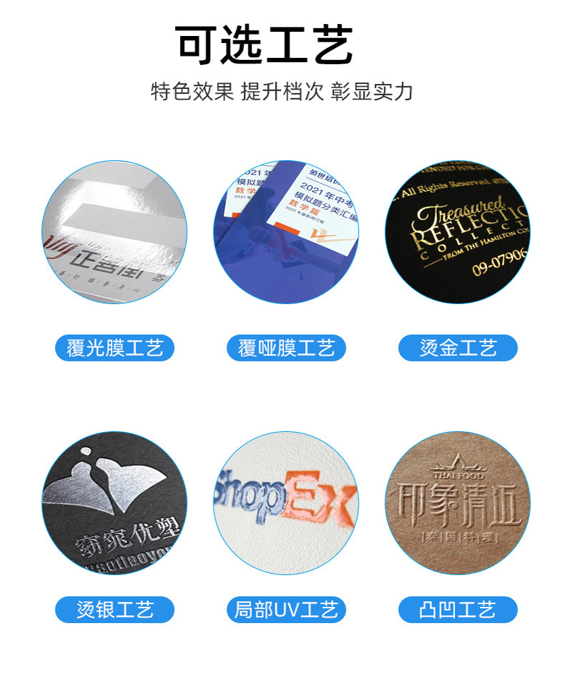 常用工藝:覆膜(啞膜、光膜)、壓紋、凹凸印、局部uv、燙銀、燙金、印專色(PANTONE色)、鏤空、鐳射、打孔、疊印、絲網印、透印、過光油、啞油等